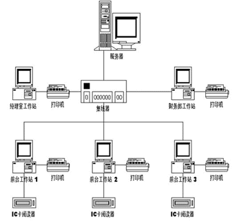 系統(tǒng)由IC卡閱讀器、工作站、服務器、打印機、相應網絡及管理軟件組成。由工作站接收IC卡閱讀器的客戶數(shù)據并輸入消費業(yè)務數(shù)據,通過網絡保存到服務器。