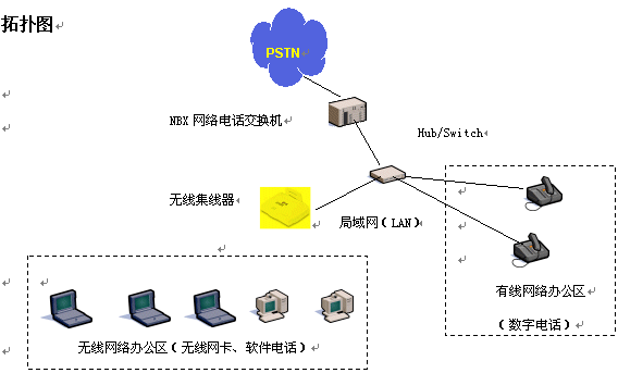 公司有大約有50人辦公流動性較大,經常出差,辦公位置不固定,每人配備一臺筆記本電腦。在電腦中安裝無線網卡和軟件電話,他們可以在公司的任何地方連接局域網,使用筆記本電腦訪問數(shù)據(jù)資源,撥打、接聽電話。