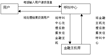 用戶(hù)通過(guò)撥打電話(huà)185連接到185客戶(hù)服務(wù)中 心,然后根據(jù)客戶(hù)服務(wù)中心的提示信息利用電話(huà)按鍵或語(yǔ)音輸入用戶(hù)的請(qǐng)求信息。用戶(hù)的請(qǐng)求信息傳送到呼叫中心后,呼叫中心會(huì)根據(jù)用戶(hù)的請(qǐng)求信息內(nèi)容進(jìn)行處理,如查詢(xún)儲(chǔ)蓄法規(guī)等,然后將處理結(jié)果反饋給用戶(hù),如果牽涉到用戶(hù)的帳戶(hù)數(shù)據(jù),則呼叫中心將用戶(hù)的請(qǐng)求首先進(jìn)行處理,然后將處理后的信息發(fā)送給金融主機(jī)房,由金融主機(jī)根據(jù)呼叫中心傳來(lái)的數(shù)據(jù)進(jìn)行帳務(wù)處理,然后將處理結(jié)果返回給呼叫中心,呼叫中心再對(duì)金融主機(jī)房返回的數(shù)據(jù)進(jìn)行處理成客戶(hù)能夠聽(tīng)到的語(yǔ)音信息,將處理結(jié)果傳給用戶(hù)。上述流程是一個(gè)單個(gè)處理流程,實(shí)際上跟用戶(hù)進(jìn)行交互時(shí),一項(xiàng)業(yè)務(wù)會(huì)有多個(gè)往返的處理流程。