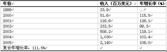 下表及下圖,顯示了Frost & Sullivan 公司預(yù)測1999年到2005年整個(gè)歐洲ASP統(tǒng)一信息產(chǎn)品市場收入增長及增長率情況。