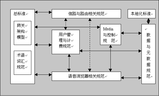 通過分析國(guó)際上各種語音網(wǎng)關(guān)系統(tǒng)極其技術(shù)規(guī)范,特別是參照 W3C組織的"Voice Browser" Activity的框架,我們認(rèn)為作為一個(gè)比較完整的語音網(wǎng)關(guān)標(biāo)準(zhǔn)體系,應(yīng)該包含以下具體標(biāo)準(zhǔn)規(guī)范的制定,通常稱之為標(biāo)準(zhǔn)需求。下圖顯示所需的規(guī)范類型及其相互關(guān)聯(lián)。
