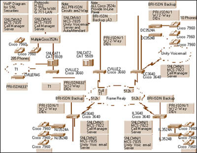 3524交換機(jī),它們能支持330多部思科IP 電話。各城市間的站點(diǎn)通過(guò)幀中繼WAN互相連接。在夏洛特斯維爾,3個(gè)基本速率接口(PRI)線路提供與公眾交換電話網(wǎng)(PSTN)的連接。由于SNL