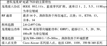 隨著思科無線IP電話7920的推出,思科公司為用戶提供了融合式無線解決方案和智能化的無線基礎(chǔ)設(shè)施,以及一款新產(chǎn)品,從而增強了IP通信在企業(yè)中發(fā)揮的作用。思科無線IP電話7920是一款方便易用的IEEE 802.11b無線IP電話,可以與Cisco CallManager和Cisco Aironet 1200、1100、350和340系列Wi-Fi(IEEE 802.11b)接入點配合,提供全面的語音通信功能。作為思科AVVID無線解決方案的一部分,思科無線IP電話7920可以在一個端到端的思科網(wǎng)絡(luò)中提供無縫的服務(wù),例如安全、移動、服務(wù)質(zhì)量(QoS)和管理。思科無線IP電話7920
