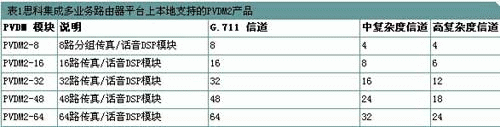 在任意思科集成多業(yè)務路由器平臺主板上使用任意思科PVDM2產(chǎn)品(PVDM2-8,PVDM2-16,PVDM2-24,PVDM2-32或PVDM2-64),可實現(xiàn)內(nèi)嵌模塊性,無需使用網(wǎng)絡模塊或AIM,即可提供會議、譯碼和話音端接。在思科集成多業(yè)務路由器中安裝思科PVDM2產(chǎn)品,可為IP話音流量和時分多路復用(TDM)流量提供這些服務。使用思科集成多業(yè)務路由器上本地安裝的VIC、VWIC或EVM(EVM僅在Cisco