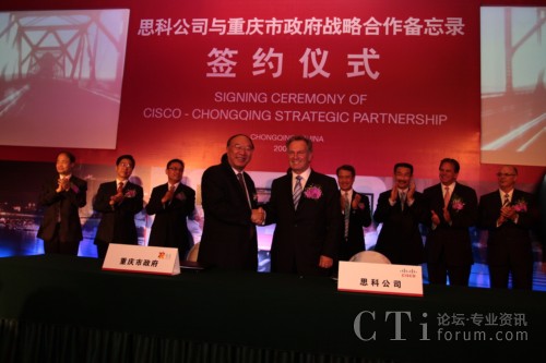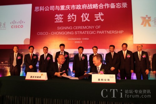 CTI論壇(ctiforum)9月14日消息:2009年9月11日,重慶市人民政府與思科正式簽訂合作備忘錄,雙方將結(jié)為戰(zhàn)略合作伙伴關(guān)系,就通信產(chǎn)品制造、“智能+互聯(lián)城市”試點(diǎn)示范、綠色技術(shù)研發(fā)與創(chuàng)新及風(fēng)險(xiǎn)投資等多方面展開(kāi)深入合作。此次合作將進(jìn)一步加快重慶市產(chǎn)業(yè)結(jié)構(gòu)和產(chǎn)品結(jié)構(gòu)調(diào)整,促進(jìn)內(nèi)陸開(kāi)放城市建設(shè);加快發(fā)展重慶通信產(chǎn)品產(chǎn)業(yè)集群,把重慶建設(shè)成為西部重要的現(xiàn)代通信產(chǎn)品制造基地;推動(dòng)以信息產(chǎn)業(yè)為主體的重慶高新技術(shù)產(chǎn)業(yè)發(fā)展以及本土創(chuàng)新和可持續(xù)性能力的提供,更高效便捷地加快本土企業(yè)的國(guó)際化進(jìn)程;整合多方國(guó)際資源,以推進(jìn)重慶在中國(guó)率先成為“智能+互聯(lián)城市”,讓市民享受更多的工作和生活便利及實(shí)惠。作為思科在華創(chuàng)新及可持續(xù)發(fā)展戰(zhàn)略實(shí)施的又一里程碑,此次合作不僅是思科“智能+互聯(lián)城市”計(jì)劃在中國(guó)與當(dāng)?shù)卣氖锥群献黜?xiàng)目,也是思科在“協(xié)作型創(chuàng)新模式”指導(dǎo)下激勵(lì)本土創(chuàng)新的全新實(shí)踐。圖:思科與重慶市政府簽署合作備忘錄