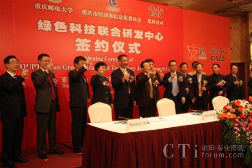 CTI論壇(ctiforum)2月3日消息(記者 潘婷):2月3日上午,思科公司與重慶郵電大學(xué)正式簽訂合作協(xié)議,共建“重慶郵電大學(xué)-思科綠色科技聯(lián)合研究實驗室”。“綠色科技聯(lián)合研究實驗室”的成立是思科履行其致力于推動中國創(chuàng)新和可持續(xù)發(fā)展承諾的重要舉措。此次合作中雙方將共同推動下一代互聯(lián)網(wǎng)、傳感器網(wǎng)絡(luò)以及綠色科技等領(lǐng)域的研發(fā),推進(jìn)應(yīng)用推廣和產(chǎn)業(yè)化發(fā)展,實現(xiàn)產(chǎn)學(xué)研一體化,幫助和支持重慶本土企業(yè)提高綠色科技創(chuàng)新的素質(zhì)和能力,進(jìn)而支持中國發(fā)展綠色經(jīng)濟(jì)、節(jié)能減排的長期戰(zhàn)略。圖:簽約儀式現(xiàn)場