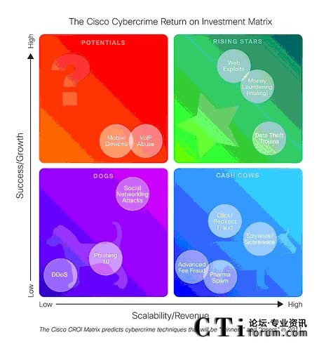 通過思科CROI矩陣對網(wǎng)絡犯罪類型的分析,思科安全專家預測:在2011年,以獲得非法利益為目的的網(wǎng)絡犯罪將會分流他們的資源。