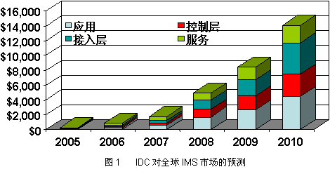 IMS作為一個(gè)通信架構(gòu),開創(chuàng)了全新的電信商業(yè)模式,拓展了整個(gè)信息產(chǎn)業(yè)的市場空間。IMS正在成為新一輪的投資熱點(diǎn)。IDC認(rèn)為,IMS市場將從目前的數(shù)百萬美元迅速增長到2010年的141億美元(如圖1)。對(duì)于電信行業(yè)來說,IMS的意義甚至超出了3G或4G,它將重新定義未來的通信業(yè)務(wù)。