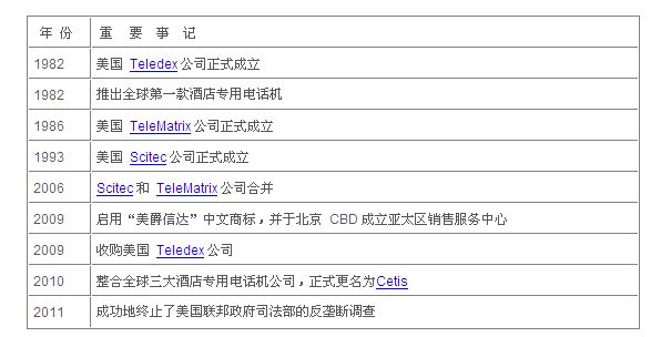 Cetis(美爵信達) 是全球酒店客房/辦公電話機的領(lǐng)導企業(yè),全球總部位于美國丹佛,在世界各地設(shè)有生產(chǎn)基地、銷售網(wǎng)絡(luò)及服務(wù)機構(gòu),并在全球擁有7000多家授權(quán)代理商。2009年12月18日,Cetis(美爵信達)在全球 CEO 孫炳南博士的領(lǐng)導下,正式收購了全球最大的酒店專用電話機公司—— 美國Teledex(德利達)公司,成為世界上最大、擁有全球酒店客房話機三大頂級品牌公司的龍頭企業(yè)。