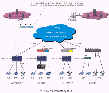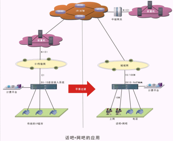 ·當(dāng)前,網(wǎng)吧如雨后春筍般地在快速建立,DX1S-VoIP系統(tǒng)向下提供10M LAN口及模擬電話接口,可利用已建設(shè)好的寬帶資源,同時架設(shè)IP超市及網(wǎng)吧,資源利用率高,成本低,收效快。