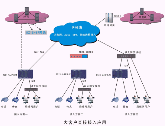 ·DX1S-VoIP系統(tǒng)可提供以太網(wǎng)、DDN、ADSL、無線網(wǎng)橋等多種接入方式,辦事處或分支機構(gòu)根據(jù)現(xiàn)有的條件可靈活選擇接入方式。