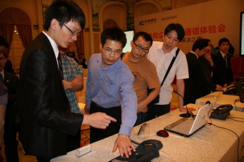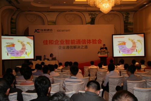 CTI論壇(ctiforum)4月25日消息(記者 潘婷婷): 廣東佳和通信技術(shù)有限公司主辦的首場(chǎng)企業(yè)智能通信體驗(yàn)會(huì),于2011年4月13日在廣州富力麗思卡爾頓酒店隆重召開,并取得圓滿成功。此次體驗(yàn)會(huì)來自佳和通信的負(fù)責(zé)人和業(yè)內(nèi)專家就佳和企業(yè)智能通信平臺(tái)的應(yīng)用以及協(xié)同辦公的發(fā)展趨勢(shì)發(fā)表了主題演講,為所有到場(chǎng)的100多位來賓做了詳實(shí)的介紹。同時(shí)展示了佳和“!毕盗械7個(gè)應(yīng)用解決方案,并對(duì)拳頭產(chǎn)品——智能IP話機(jī)T600、移動(dòng)分機(jī)M600、個(gè)人助理軟件IPA PRO等進(jìn)行了現(xiàn)場(chǎng)演示和互動(dòng),其目的在于使現(xiàn)場(chǎng)嘉賓充分感受企業(yè)智能通信的價(jià)值和魅力,同時(shí)親身體驗(yàn)到如何在在加速辦公自動(dòng)化的同時(shí)提高企業(yè)效率、節(jié)約成本。CTI論壇報(bào)道