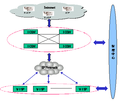 整個語音互聯(lián)網(wǎng)由V-ISP接入服務(wù)平臺、ICGW信息控制關(guān)口、V-ICP內(nèi)容提供平臺、管理平臺四部分組成。這四部分分別完成不同的功能。