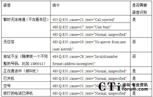 從歸納的情況看,只有無應(yīng)答和地址不全兩種情況是可靠信令分析來識(shí)別的,其他的5種情況都無法通過信令檢測識(shí)別。特別是暫時(shí)無法接通的語言提示,播放完提示音有3種不同的信令,應(yīng)該是屬于不同的情況,但是放了相同的語音。因此造成號(hào)碼識(shí)別錯(cuò)誤的現(xiàn)象。