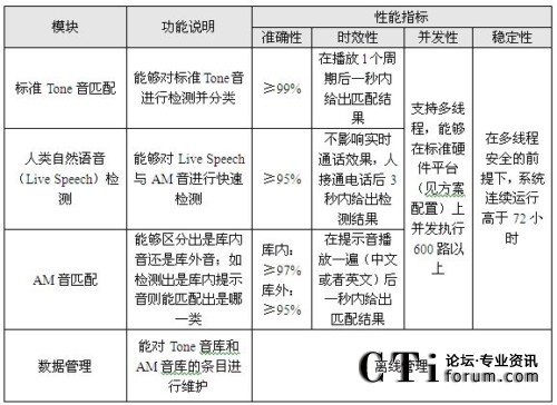 圖中,Tone音匹配采用模式匹配方法,可以實(shí)現(xiàn)對(duì)振鈴音,忙音,空號(hào),不可達(dá)音等100多種標(biāo)準(zhǔn)提示音的識(shí)別。AM(Answering Machine)音匹配主要負(fù)責(zé)識(shí)別傳真機(jī)、自動(dòng)答錄機(jī)等機(jī)器語音,同樣采用模式匹配方法,將收到的語音與標(biāo)準(zhǔn)樣本庫進(jìn)行比對(duì)。人類自然語音檢測的功能主要通過人真實(shí)聲音的檢測,來判斷是否需要進(jìn)行語音匹配。