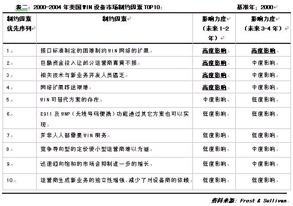 美國的WIN市場(chǎng)盡管處于強(qiáng)勢(shì)發(fā)展過程中,但這其中的變數(shù)也是有的。根據(jù)Frost & Sullivan 資料,2000-2004年間制約該市場(chǎng)發(fā)展的主要因素與影響力度見表二: