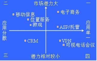 * 第三象限:市場潛力比較小,應用比較分散。由于經(jīng)營靈活,貼近客戶,小服務提供商在此會有非常大的優(yōu)勢。大型運營商如想經(jīng)營此象限內(nèi)的業(yè)務,必須努力減小不同用戶需求的差異,并造成成本領先。如客戶關系管理(CRM)。
