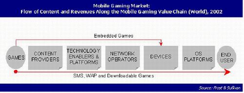 如果市場潛力足夠大,那么選擇適當?shù)臉I(yè)務模式就是實現(xiàn)市場潛力的保證。而業(yè)務模式的選擇是與業(yè)務的市場價值鏈分不開的。在一些市場價值鏈較復雜的應用中,業(yè)務模式的選擇尤為重要,例如,下圖所示的移動游戲的價值鏈就是較復雜的一個: