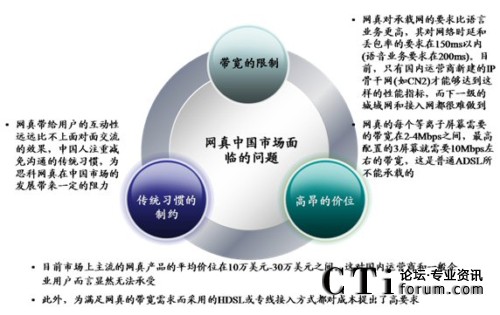然而網真產品在中國市場的推廣,仍然面臨一些無可避免的問題:帶寬的限制、高昂的價位、傳統(tǒng)習慣的制約,其中高昂的價位是目前網真產品推廣中亟需解決的問題。