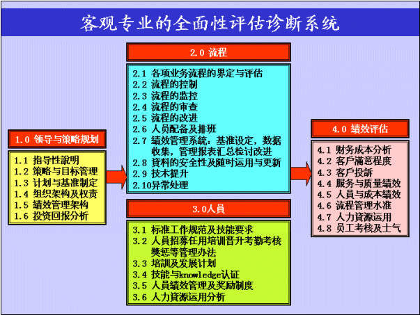 此評估診斷系統(tǒng)以1.0領(lǐng)導與決策規(guī)劃為起始點,作為建立一個以客戶為核心的高質(zhì)量客戶服務(wù)中心的推動根源,并且制定了一個良好的4.0績效評估系統(tǒng),以確保經(jīng)營目標與標準質(zhì)量基準能確實達成,此過程需透過嚴謹?shù)牧鞒淘O(shè)計和高效的人員管理去執(zhí)行這套運營體系。