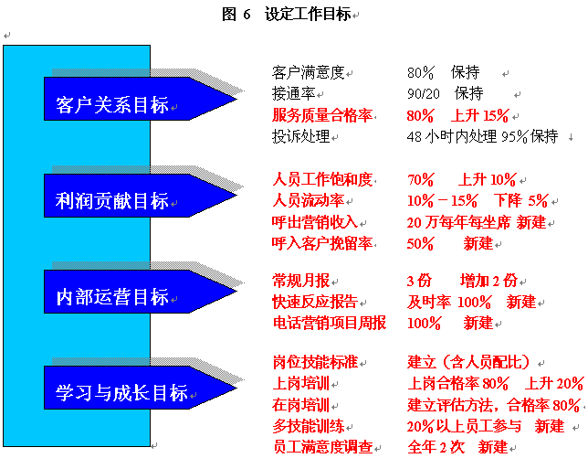 根據(jù)年度重點(diǎn)工作及目標(biāo),我們就可以設(shè)計(jì)關(guān)鍵措施來使其實(shí)現(xiàn)。通常一項(xiàng)關(guān)鍵措施可以有助于幾個(gè)目標(biāo)的達(dá)成。如建立培訓(xùn)體系,可以使得在崗培訓(xùn)、上崗培訓(xùn)、多技能訓(xùn)練以及崗位技能達(dá)標(biāo)率有所提升,而體現(xiàn)在業(yè)務(wù)上的效果則是服務(wù)質(zhì)量的提升、呼出營銷收入增加和客戶挽留率提高。