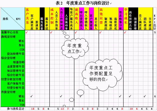 在這里,我們先以崗位設(shè)計(jì)來舉例。經(jīng)常有呼叫中心主管把每個(gè)崗位的職責(zé)都設(shè)計(jì)的非常詳細(xì),包括了每天來做什么,說什么,錄入什么,甚至是打掃某區(qū)域衛(wèi)生之類。但是,我看遍了每一條,也沒找到這個(gè)崗位應(yīng)該對(duì)什么業(yè)績"負(fù)責(zé)任",該對(duì)哪些工作做出貢獻(xiàn)。此處建議各位把效益評(píng)價(jià)體系、年度重點(diǎn)工作與崗位設(shè)計(jì)結(jié)合起來。如表2所示,我們可以把效益評(píng)價(jià)體系作為KPI放在橫坐標(biāo)中,而崗位設(shè)置則是縱坐標(biāo)。每個(gè)崗位對(duì)應(yīng)的行中,可以勾畫其應(yīng)負(fù)責(zé)或者做出主要貢獻(xiàn)的項(xiàng)目。這些項(xiàng)目不能超過6個(gè),因?yàn)樘嗟捻?xiàng)目會(huì)使得這個(gè)崗位無所適從,最終的結(jié)果是哪個(gè)也沒做好。當(dāng)你勾畫完成之后,請(qǐng)計(jì)算每列的"對(duì)勾"數(shù)目,看看你本年度的重點(diǎn)工作是不是有較多崗位負(fù)責(zé)呢?