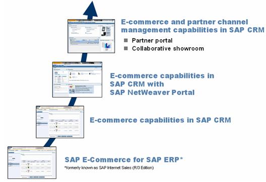 一、SAP CRM中電子商務(wù)功能的進(jìn)化 從上圖中,我們可以清楚地看出SAP的電子商務(wù)(E-Commerce)功能經(jīng)歷了一個(gè)不斷進(jìn)化的過程。主要分成以下四個(gè)階段: