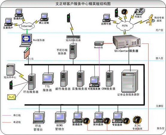 泰陽(yáng)證券有客戶2萬(wàn)多,相當(dāng)一部分要通過(guò)電話委托程序作交易。原有電話委托系統(tǒng)是模擬線。交易忙時(shí),很多股民打不進(jìn)去。以前的業(yè)務(wù)相對(duì)也比較簡(jiǎn)單。文正明公司在了解了泰陽(yáng)方面的業(yè)務(wù)需要后,用公司的UniCenter系統(tǒng)和深圳東進(jìn)公司的ISDN數(shù)字卡、傳真卡和座席卡,為泰陽(yáng)搭建了一個(gè)新的語(yǔ)音應(yīng)用平臺(tái)。
