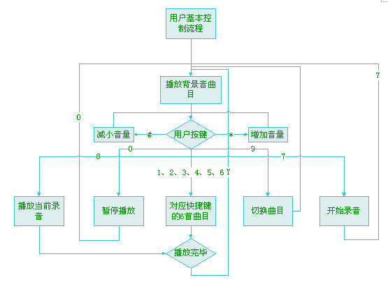 用戶設(shè)定:用戶可以通過語音自動導(dǎo)航或者通過上網(wǎng)來自主選擇并設(shè)定背景音效,并把其中最常用的六種音效對應(yīng)1~6號按鍵,這樣用戶在自己使用的過程中就可以根據(jù)當(dāng)時的情況使用自己喜歡的背景音效了。