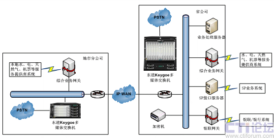 東進(jìn)固網(wǎng)支付平臺(tái)通過(guò)IP專網(wǎng)將省公司和各地市公司的系統(tǒng)連接起來(lái),采取二級(jí)地市分公司數(shù)據(jù)接入、運(yùn)營(yíng)商總部集中處理的拓?fù)浼軜?gòu),實(shí)現(xiàn)業(yè)務(wù)的全省統(tǒng)一運(yùn)營(yíng)。各地市公司分別建設(shè)一套接入平臺(tái),業(yè)務(wù)處理服務(wù)器統(tǒng)一建設(shè)在運(yùn)營(yíng)商總部。各地市的水、電、煤氣、電信、彩票等外部系統(tǒng)通過(guò)在本地建設(shè)的綜合業(yè)務(wù)網(wǎng)關(guān)與業(yè)務(wù)系統(tǒng)對(duì)接,支付業(yè)務(wù)統(tǒng)一通過(guò)運(yùn)營(yíng)商總部所在地銀聯(lián)轉(zhuǎn)到各地銀聯(lián)進(jìn)行。