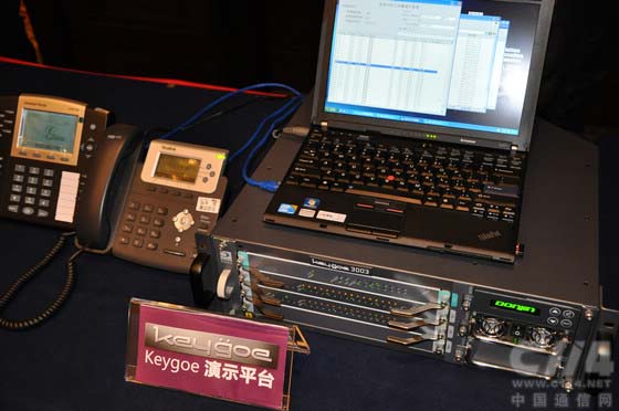 現(xiàn)場(chǎng)兩套演示系統(tǒng)中,一套以Keygoe 3000系列機(jī)箱承載最新研發(fā)的高密度VoIP資源處理板PFBT480X,實(shí)現(xiàn)整機(jī)最大1920路VoIP語音處理,展示了keygoe 3000多媒體交換機(jī)在大容量IP呼叫和語音處理的卓越性能。另一套則展示了最新的Keygoe1001系列多媒體交換機(jī),該機(jī)通過內(nèi)置主控CPU板,將語音交換、語音處理以及應(yīng)用程序整合在一個(gè)高為1U的物理機(jī)箱中,為中小型規(guī)模業(yè)務(wù)應(yīng)用提供具有較強(qiáng)綜合性、靈活性和完整性的運(yùn)營(yíng)平臺(tái)。