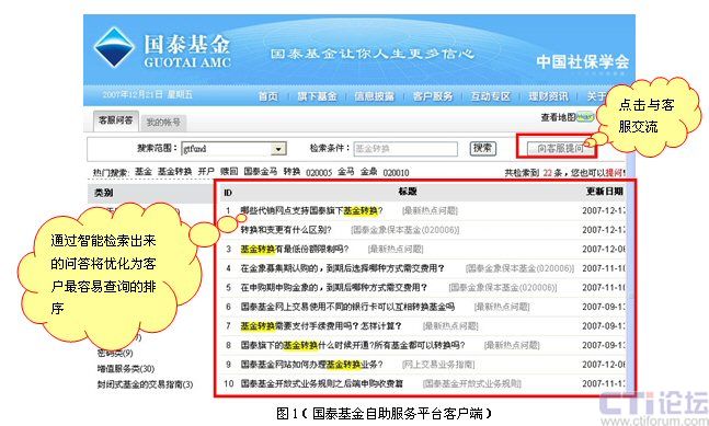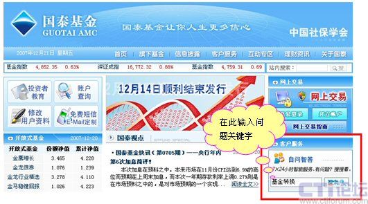 國泰基金成立于1998年3月5日,是國內(nèi)按照規(guī)范化要求成立的首批基金管理公司之一,注冊資本為1.1億,總部位于上海。贏得了包括封閉式和開放式基金近150萬持有人的信任,成為了一家市場信譽(yù)良好、具有較高知名度的專業(yè)證券投資管理公司,得到社會中介機(jī)構(gòu)的諸多肯定。日前,該公司運用53IQ客戶自助服務(wù)系統(tǒng),進(jìn)一步拓展客戶服務(wù)方式,實現(xiàn)了先進(jìn)的客戶關(guān)系管理。 圖1(國泰基金自助服務(wù)平臺入口)