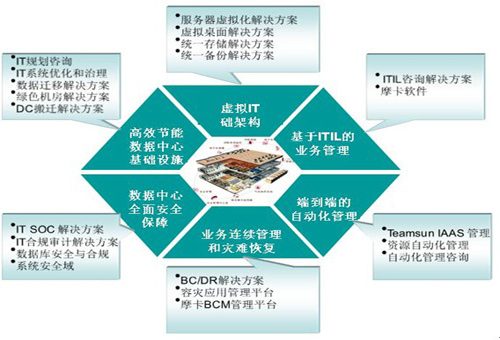 圍繞云計(jì)算數(shù)據(jù)中心的建設(shè),華勝天成共開(kāi)發(fā)了多個(gè)解決方案,且每個(gè)解決方案均有專(zhuān)業(yè)的售前支持團(tuán)隊(duì)和售后實(shí)施團(tuán)隊(duì),這些解決方案不是分散而無(wú)關(guān)的,而是針對(duì)用戶的不同情況,在各方面均給予綜合考慮,以最優(yōu)的設(shè)計(jì)方案來(lái)滿足用戶的需要,并兼顧另外方面的后繼需求。