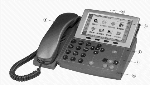 InfoPhone與普通電話機的最大區(qū)別在于:她擁有增強型的操作面板(圖中標(biāo)識2),超清晰的液晶顯示螢?zāi)? 圖中標(biāo)識3),手感舒適的點觸筆(圖中標(biāo)識5),實用型的狀態(tài)指示燈(圖中標(biāo)識6)。通過點觸筆和操作面板上的按鍵點選和控制液晶顯示螢?zāi)簧系倪x項,完成相應(yīng)的操作。