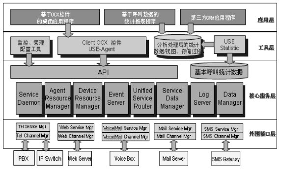 青牛USE從體系結(jié)構(gòu)上分為四個層次。第一層為外圍接口層,負(fù)責(zé)接入、抽象和發(fā)布來自不同渠道的服務(wù)請求;第二層是核心服務(wù)層,它是青牛USE軟件的核心部分,對來自不同渠道的服務(wù)請求和服務(wù)回復(fù)進(jìn)行統(tǒng)一的服務(wù)排隊(duì)管理、資源調(diào)度管理、日志數(shù)據(jù)管理等,屏蔽了不同渠道的物理特性,真正實(shí)現(xiàn)統(tǒng)一路由、統(tǒng)一管理;第三層是工具層,是青牛USE提供給應(yīng)用開發(fā)商和集成商的開發(fā)接口和配置工具;第四層,USE產(chǎn)品的應(yīng)用層,為呼叫中心應(yīng)提供應(yīng)用功能,比如:呼叫統(tǒng)計分析、呼叫監(jiān)控等。