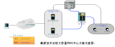 該方案利用青牛USE、網絡IVR等產品,通過青牛網絡IVR節(jié)點間的集群,實現了對呼叫中心的重新釋義,實現了呼叫中心的線性擴容,有效解決以下問題: