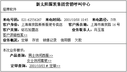 呼叫中心是以CTI技術(shù)為根本的,它的長(zhǎng)項(xiàng)就在于能把計(jì)算機(jī)系統(tǒng)與電話系統(tǒng)集成起來。在呼叫中心所集成的計(jì)算機(jī)系統(tǒng)中,除了呼叫中心本身的應(yīng)用軟件外,更重要的就是與ERP(企業(yè)資源計(jì)劃)系統(tǒng)集成后產(chǎn)生的功能強(qiáng)大的座席端應(yīng)用軟件。實(shí)際上,與ERP系統(tǒng)無縫連接的座席端應(yīng)用軟件,很容易就能擴(kuò)充為一個(gè)簡(jiǎn)單的CRM(客戶關(guān)系管理)系統(tǒng)。這時(shí),呼叫中心就真正成了服裝生產(chǎn)商整個(gè)運(yùn)營(yíng)管理體系中的溝通樞紐和響應(yīng)中心。