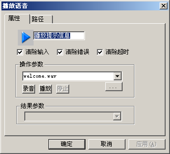 并不是所有的模塊都有操作參數(shù)和結(jié)果參數(shù),有些模塊可能只有其中的一個(gè),有些模塊兩個(gè)參數(shù)都沒有。例如:播放語音模塊必需有操作參數(shù)--要播放的語音文件的文件名,但它沒有結(jié)果參數(shù);存儲(chǔ)變量模塊必需有結(jié)果參數(shù)--變量名,但它沒有操作參數(shù);運(yùn)算模塊既有操作參數(shù),也有結(jié)果參數(shù);取消轉(zhuǎn)隊(duì)列模塊和退出模塊則沒有參數(shù)。