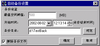 自動備份由事先設(shè)定的磁盤空間報警閾值觸發(fā),它會發(fā)出信息提示或聲音提示,然后將用戶事先確定的時間范圍內(nèi)的錄音文件全部備份到客戶機硬盤、磁盤陣列或其他記錄介質(zhì)上,并且可以自動刪除系統(tǒng)硬盤上已經(jīng)被備份出來的文件。