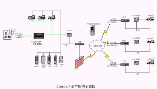 硬件:中心點(diǎn)有ZingSwitch®,O口網(wǎng)關(guān)和內(nèi)線卡,VPN動(dòng)態(tài)注冊服務(wù)器和VPN設(shè)備,或GK服務(wù)器。座席端配置S口網(wǎng)關(guān),根據(jù)需求配置相應(yīng)的VPN設(shè)備。
