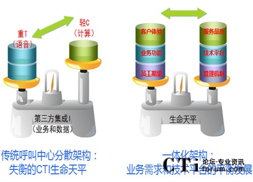 因此很長(zhǎng)一段時(shí)間以來呼叫中心都作為語(yǔ)音通訊的分支之一而存在,而這種定位給呼叫中心的生命力帶來了不平衡的發(fā)展,根源就在于“輕C重T第三方集成I”的格局:語(yǔ)音處理性能和功能強(qiáng)大,計(jì)算能力和數(shù)據(jù)處理弱,因此將業(yè)務(wù)集成和數(shù)據(jù)集成交由第三方承擔(dān)。因此很長(zhǎng)一段時(shí)間,造成呼叫中心在企業(yè)購(gòu)買之后對(duì)業(yè)務(wù)應(yīng)用的適應(yīng)能力差、業(yè)務(wù)發(fā)展和變化時(shí)系統(tǒng)穩(wěn)定性變的無法保證。