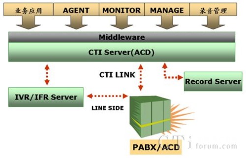 聯(lián)絡(luò)中心主要由電話呼叫分配(PBX/ACD)、計(jì)算機(jī)電話集成(CTI)、交互式語音應(yīng)答(IVR)、實(shí)時(shí)錄音和自動外撥等組成,逐漸形成了一個復(fù)雜的多系統(tǒng)異構(gòu)平臺。