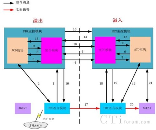 通過PBX/ACD建立一種電話路由共享和語音溢出的方法,實(shí)現(xiàn)多套聯(lián)絡(luò)中心平臺之間語音的動態(tài)互溢,透明地為客戶提供優(yōu)質(zhì)、及時(shí)的電話服務(wù),客戶感覺不到任何差異。通過PBX/ACD建立一種電話路由共享和語音溢出的方法,作為行業(yè)現(xiàn)有實(shí)現(xiàn)方法的有效補(bǔ)充,解決了行業(yè)現(xiàn)有實(shí)現(xiàn)方法的無法實(shí)現(xiàn)最短路徑溢出問題,通過ACD的“先排隊(duì)后進(jìn)門”的預(yù)約預(yù)定模式,動態(tài)判斷彼此的運(yùn)行狀態(tài)和處理能力,無需先將語音溢出到另外一個聯(lián)絡(luò)中心,只有當(dāng)另外一個聯(lián)絡(luò)中心確定能提供相應(yīng)的語音服務(wù)和人工服務(wù)的時(shí)候,語音才在PBX語音層面通過標(biāo)準(zhǔn)通信協(xié)議進(jìn)行互聯(lián)互通,避免實(shí)時(shí)語音被多次溢出,實(shí)時(shí)實(shí)時(shí)語音溢出只走最短路徑,保證客戶電話只需一次溢出就能立即提供語音服務(wù)和人工服務(wù),大幅減少了語音溢出的處理時(shí)間,同時(shí)也大幅減少了語音處理次數(shù),提升了系統(tǒng)處理性能。