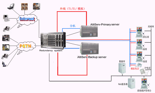 奧迪堅通訊系統(tǒng)有限公司作為CTI通訊平臺的提供商,在技術上不斷創(chuàng)新,對產品精益求精,尤其體現(xiàn)在對系統(tǒng)的運行安全性的要求上,為了防止電信接入設備或者企業(yè)網(wǎng)絡出現(xiàn)故障而造成的呼叫中心服務中斷,奧迪堅呼叫中心系統(tǒng)提供安全保護冗余切換系統(tǒng),來保障呼叫中心在意外情況下的正常工作,該安全冗余切換系統(tǒng)通過對電源、T1/E1、模擬trunk、分機座席、以及各種網(wǎng)絡鏈路串口等備份切換來實現(xiàn)可靠的運行。除此之外,奧迪堅系統(tǒng)本身也提供強大的安全保障,由于采用先進IP內核一體化設計,集傳統(tǒng)PBX、CTI服務器、IVR、ACD、Recording、FAX等眾多設備于一體,這樣有效的避免了因為外掛設備過多以及設備供應商的不同而存在的兼容性的問題,從而降低了給呼叫中心系統(tǒng)帶來的的不穩(wěn)定的安全隱患。在系統(tǒng)之外依靠安全保護冗余切換系統(tǒng),可以實現(xiàn)外線、分機、以及各種鏈路接口的雙倍安全運行。如上圖所示:兩臺奧迪堅的呼叫中心服務器和奧迪堅安全冗余切換系統(tǒng)構成呼叫中心熱備份系統(tǒng),在兩臺服務器中安裝所有的呼叫中心功能模塊。通常情況下由主呼叫中心服務器提供系統(tǒng)的正常運行,備份服務器通過安全保護冗余切換系統(tǒng)的服務監(jiān)測模塊來監(jiān)測主服務器的各項設備和鏈路的使用情況,當主服務器遭遇突發(fā)故障不能繼續(xù)工作時,系統(tǒng)馬上實施自動切換,就會通過安全保護冗余切換系統(tǒng)將系統(tǒng)切換到備份的呼叫中心系統(tǒng)上來,此鏈路可以是數(shù)據(jù)、語音、網(wǎng)絡、串口等。當安全保護冗余切換系統(tǒng)自身出現(xiàn)斷電或者其他故障時,所有鏈路均保持正常工作狀態(tài)。