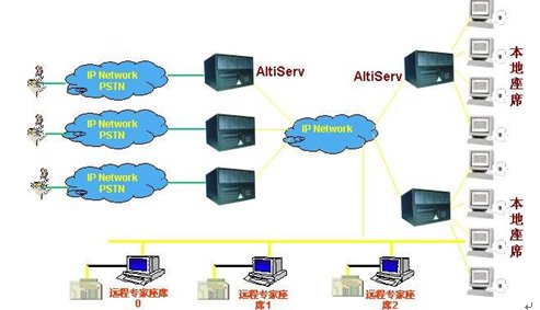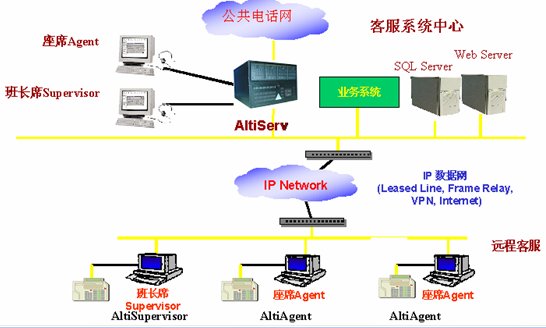這種組合節(jié)省管理成本,因?yàn)樗械淖瘑T都在一點(diǎn),便于管理控制,同時(shí)用戶只要撥打本地電話即可進(jìn)入系統(tǒng)接收服務(wù),如需人工座席應(yīng)答的話系統(tǒng)會(huì)自動(dòng)將來(lái)電通過(guò)Internet轉(zhuǎn)接到座席員處,對(duì)公司的話費(fèi)成本也較低(都是通過(guò)Internet實(shí)現(xiàn)的長(zhǎng)途轉(zhuǎn)接功能)。同時(shí)AltiGen也支持通過(guò)IP分機(jī)的方式遠(yuǎn)程登錄到系統(tǒng)實(shí)現(xiàn)遠(yuǎn)程座席的功能,這樣對(duì)有些高級(jí)話務(wù)員或?qū)<易,不必每天到公司上班,可以通過(guò)家里的電腦登錄到AltiGen系統(tǒng),作為系統(tǒng)的一個(gè)分機(jī)來(lái)完成所有的座席員的功能,在他的電腦屏幕上也能彈出來(lái)電人的信息。系統(tǒng)的組網(wǎng)圖如下: