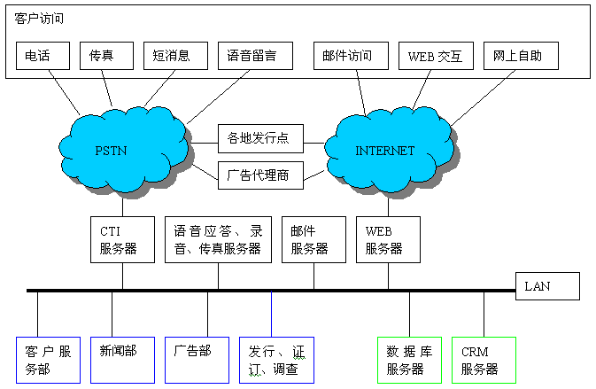 針對媒體行業(yè)的具體特點,中唐科技公司推出協(xié)同CRM。它結(jié)合呼叫中心,實現(xiàn)對客戶多渠道交互,并將客戶信息進行統(tǒng)一管理,實現(xiàn)整個單位以客戶為中心協(xié)同運作。對外實現(xiàn)一對一的個性化服務(wù),提高客戶忠誠度,擴大市場份額。對內(nèi)強化各部門的協(xié)調(diào)工作,提高工作效率。同時積累企業(yè)客戶信息數(shù)據(jù)庫這一無形資產(chǎn),提高決策的準(zhǔn)確性。