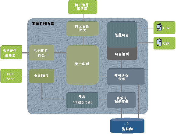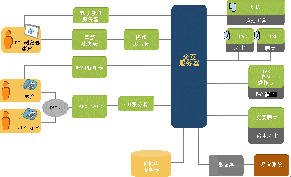 交互(輔助)服務(wù)器是客戶服務(wù)系統(tǒng)體系結(jié)構(gòu)的主要組件,控制所有的客戶交互以及它們在座席代表間的分配。其主要功能是: