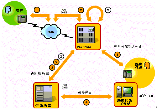 ②呼叫到達業(yè)務(wù)交換機并通知服務(wù)器(ANI –自動號碼識別)