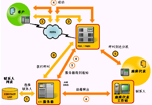 在“呼出”交互中,一個標準的客戶服務(wù)系統(tǒng)應(yīng)該預(yù)裝有一個用于執(zhí)行的聯(lián)系人列表,然后自動生成呼叫并且將呼叫分配至可用的座席代表,如下圖所示: