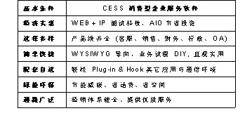 CESS消費(fèi)型服務(wù)軟件具有經(jīng)濟(jì)實(shí)惠、選擇多樣、簡(jiǎn)單快捷、配套自選、綠能環(huán)通路廣泛等特點(diǎn),采用Web+IP的潮流科技,AIO節(jié)省投資,使軟件經(jīng)濟(jì)實(shí)惠;CESS軟件產(chǎn)品線齊全,涵蓋客服、銷售、財(cái)務(wù)、行政、OA等很多方面,給您多樣選擇;WYSIWYG(所見即所得)導(dǎo)向,業(yè)務(wù)流程DIY,讓您至需要?jiǎng)觿?dòng)鼠標(biāo)就可以DIY您想要得到的設(shè)計(jì),不再需要麻煩IT人員,只管實(shí)用,簡(jiǎn)單快捷;輕松Plug-in & Hook其它應(yīng)用與通信環(huán)境,可根據(jù)您的需要配套自選;節(jié)能減碳、省話費(fèi)、省空間,綠色環(huán)保;經(jīng)銷體系健全、提供優(yōu)質(zhì)服務(wù),通路廣泛。